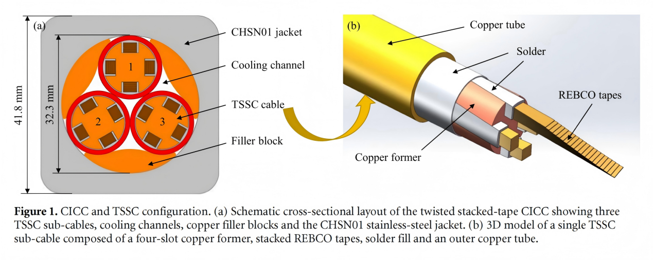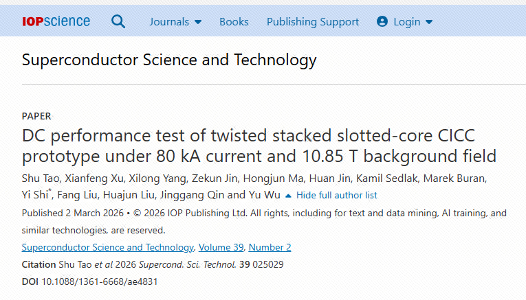 近日,中国科学院等离子体物理研究所联合中国科学技术大学、合肥工业大学、洛桑联邦理工学院在《Superconductor Science and Technology》期刊发表题为《DC performance test of twisted stacked slotted-core CICC prototype under 80 kA current and 10.85 T background field》的论文。研究团队成功研制出一根长2.8米的大电流高温超导CICC导体,并顺利在瑞士SULTAN完成测试。该CICC导体所使用的全部REBCO高温超导带材均由上海超导提供,再次验证了上海超导带材产品在聚变工况下稳定、可靠的优异性能。